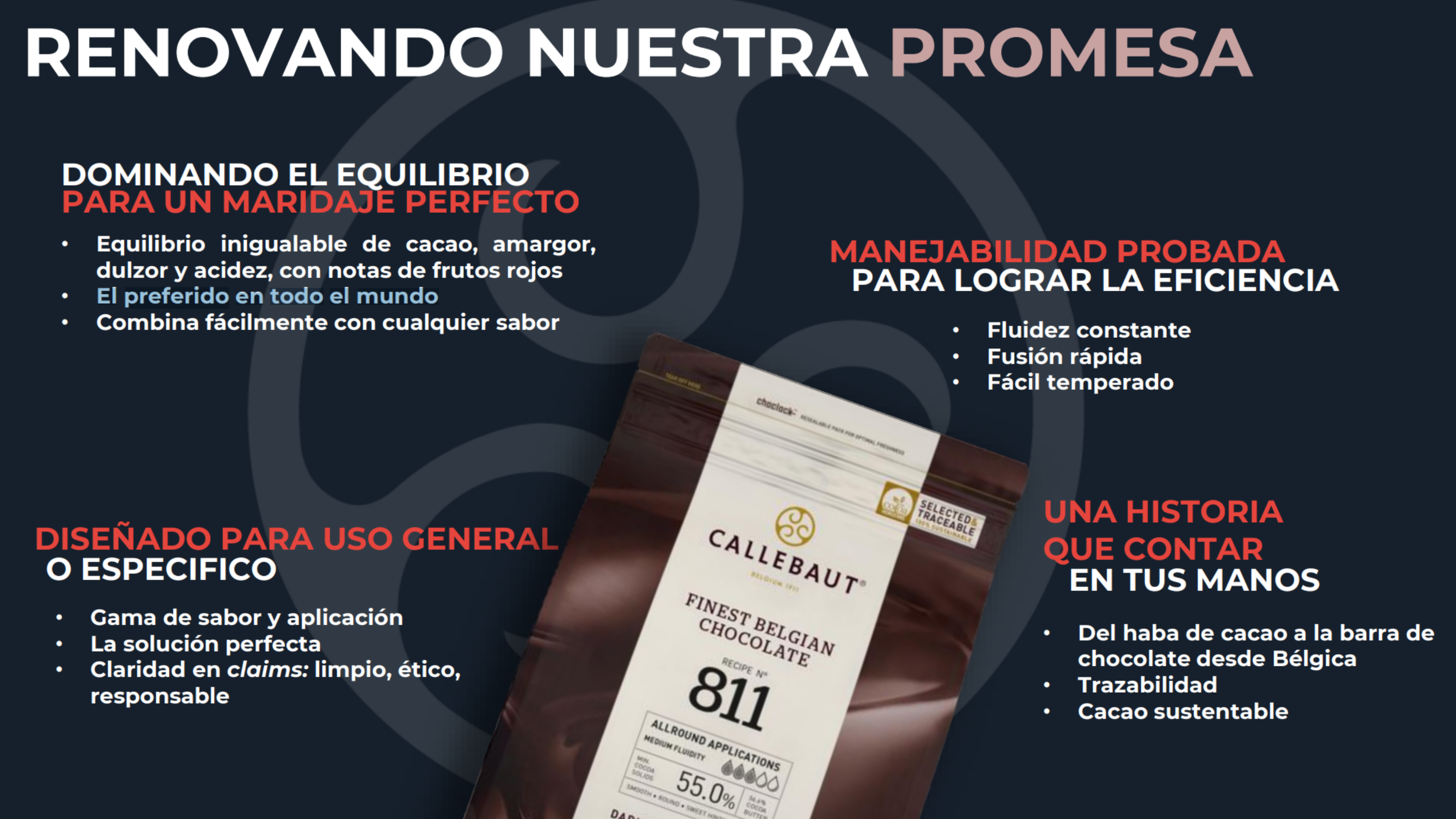 Delicioso chocolate oscuro para coberturas profesionales, con un sabor semi-amargo y 54.5% de cacao.